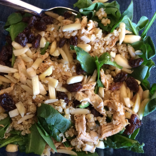 Friday: Spinach salad with chicken, hard boiled egg, avocados, raisins and parm cheese.  I typically use balsamic and oil for the dressing with a little dijon to give some flavor and zing.