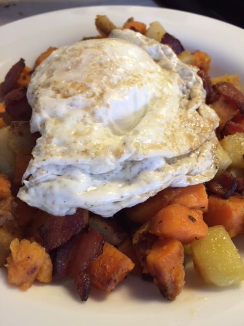 In an attempt to have some breakfast and lunch options for the week, I chopped some russet and sweet potatoes and fried them up in the same skillet I used to cook some chopped bacon.  I reunited the bacon and the potatoes on a few different occasions, and topped with a runny fried egg.  So satisfying.